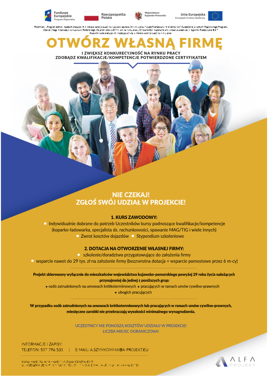 ALFA PROJEKT Sp. z o. informuje, że 03.01.2022 r. rozpoczął się II nabór zgłoszeń na ścieżkę dotacyjną w ramach projektu pn: Program pomocy osobom pracującym w niekorzystnej sytuacji na kujawsko-pomorskim rynku pracy, który potrwa do 28.02.2022 r. W ramach projektu uczestnicy mogą otrzymać bezzwrotną dotację na otworzenie działalności gospodarczej w wysokości 23.050,00 zł (stawka jednostkowa) wraz z możliwością uzyskania wsparcia pomostowego na pokrycie bieżących wydatków przez pierwsze 6 miesięcy związanych z prowadzeniem firmy w kwocie 1.000,00 zł netto/miesiąc (łącznie 6.000,00 zł netto) – dla 27 Uczestników Projektu. Dostępna będzie również ścieżka podnoszenia kwalifikacji/ kompetencji zawodowych.