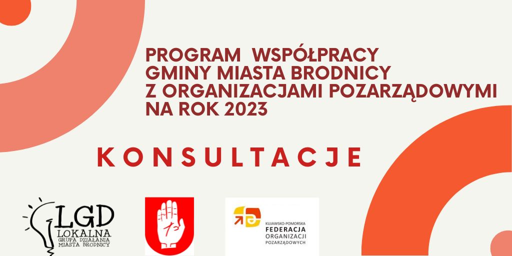 Konsultacje społeczne Programu prowadzone są we współpracy z Gminą Miasta Brodnicy. LGD Miasta Brodnicy pozyskało grant rzeczniczy na realizację procesu konsultacji społecznych Programu współpracy. Grant pochodzi ze środków Kujawsko-Pomorskiej Federacji Organizacji Pozarządowych w ramach konkursu “Wspólne sprawy, wspólne działania. Granty i bony dla organizacji pozarządowych”.