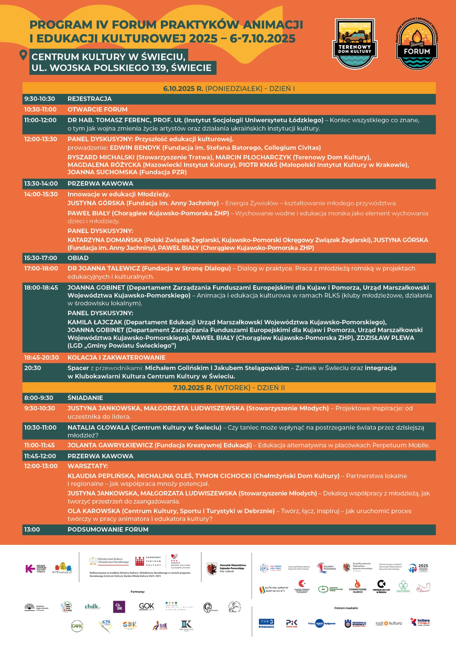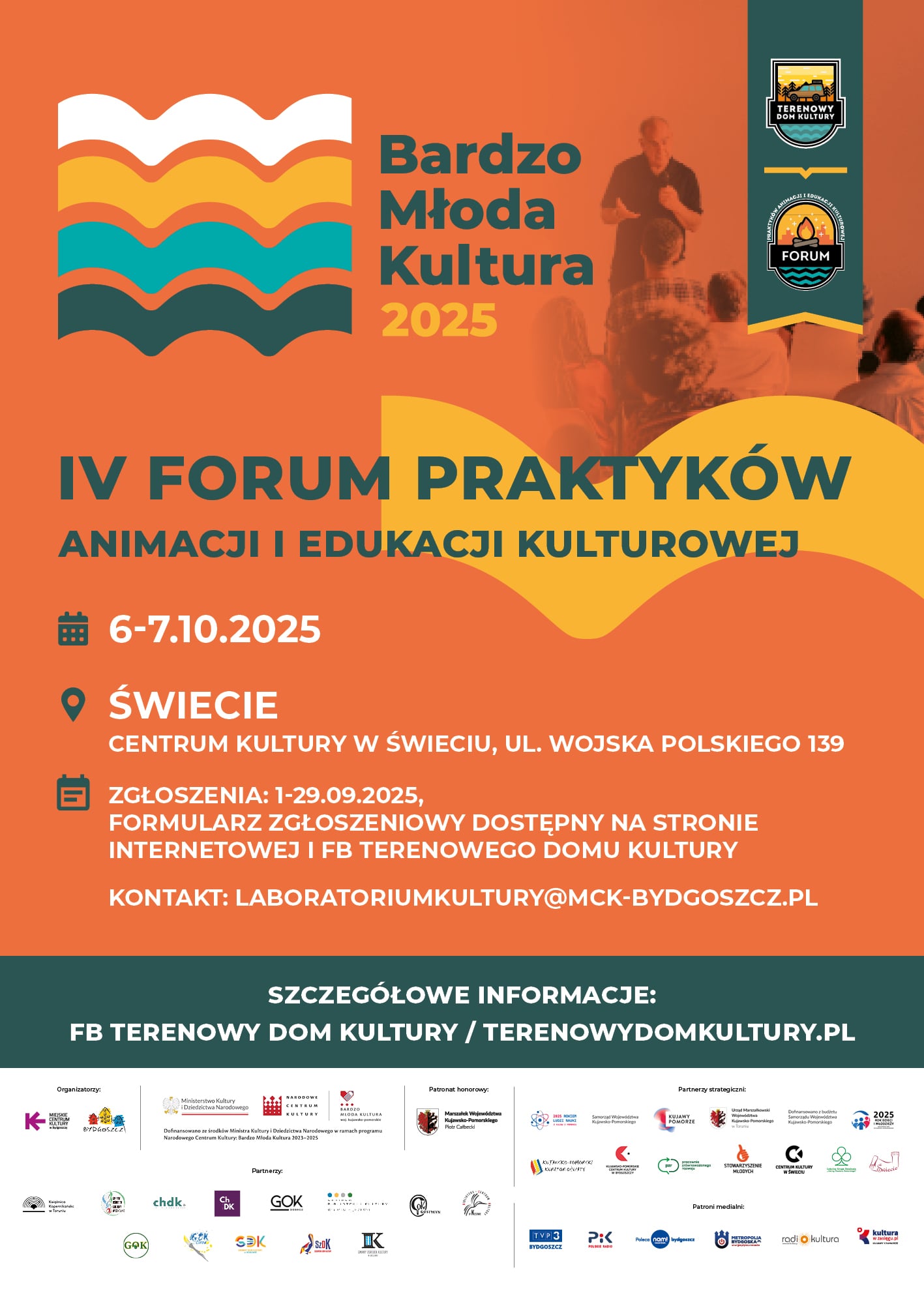 Miejskie Centrum Kultury w Bydgoszczy zaprasza na IV Forum Praktyków Animacji i Edukacji Kulturowej w ramach programu Bardzo Młoda Kultura Kujawsko-Pomorskie 2025, które odbędzie się 6-7 października w Centrum Kultury w Świeciu.
